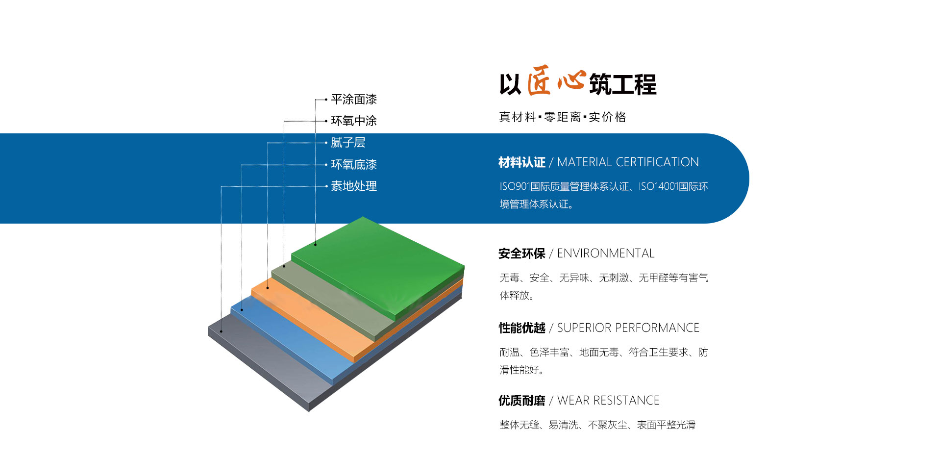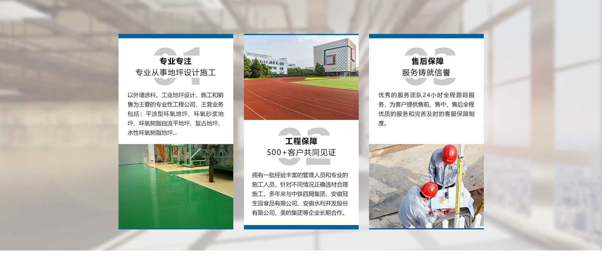 安徽世博裝飾工程有限公司成立于2009年,是一家以外墻涂料、工業(yè)地坪設(shè)計(jì)、施工和銷(xiāo)售為主要的專(zhuān)業(yè)性工程公司、是工業(yè)地坪施工的專(zhuān)業(yè)企業(yè)。公司設(shè)立了售后服務(wù)中心,用戶(hù)遍布全國(guó)大中小城市,一大批具有標(biāo)志性的長(zhǎng)期合作伙伴。“世博公司”環(huán)氧地坪工程,受到了越來(lái)越多的不同行業(yè)用戶(hù)的好評(píng)及青睞。公司擁有一批經(jīng)驗(yàn)豐富的管理人員和專(zhuān)業(yè)的施工人員,以保障產(chǎn)品的成功應(yīng)用,用較小的代價(jià)獲得理想的效果,尤其在地坪涂裝方面優(yōu)勢(shì)突出。而且以好的品質(zhì)管理模式,向客戶(hù)提供“獨(dú)具魅力”、“性能優(yōu)異”、“質(zhì)量穩(wěn)定”的產(chǎn)品。公司主要產(chǎn)品包括:平涂型環(huán)氧地坪、環(huán)氧砂漿地坪、環(huán)氧樹(shù)脂自流平地坪、滾涂型防靜電地坪、自流平防靜電地坪、復(fù)古地坪、水性環(huán)氧樹(shù)脂地坪、彩色透水混凝土地坪、壓花壓模藝術(shù)地坪、金剛砂耐磨硬化地坪、混凝土密封固化劑地坪、乙烯基酯重防腐地坪、GEP 標(biāo)準(zhǔn)型地坪、彈性PU運(yùn)動(dòng)場(chǎng)地坪、塑膠跑道地坪,PVC橡膠地板、停車(chē)場(chǎng)地坪、無(wú)震...